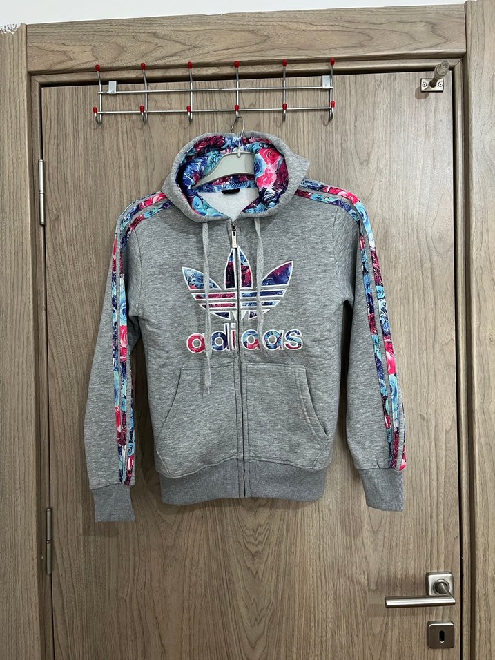 Kızlar için uzun kollu, kapüşonlu ve fermuarlı Adidas sweatshirt. Yumuşak ve sıcak kumaş, kollar ve kapüşonda renkli baskılar bulunur.
