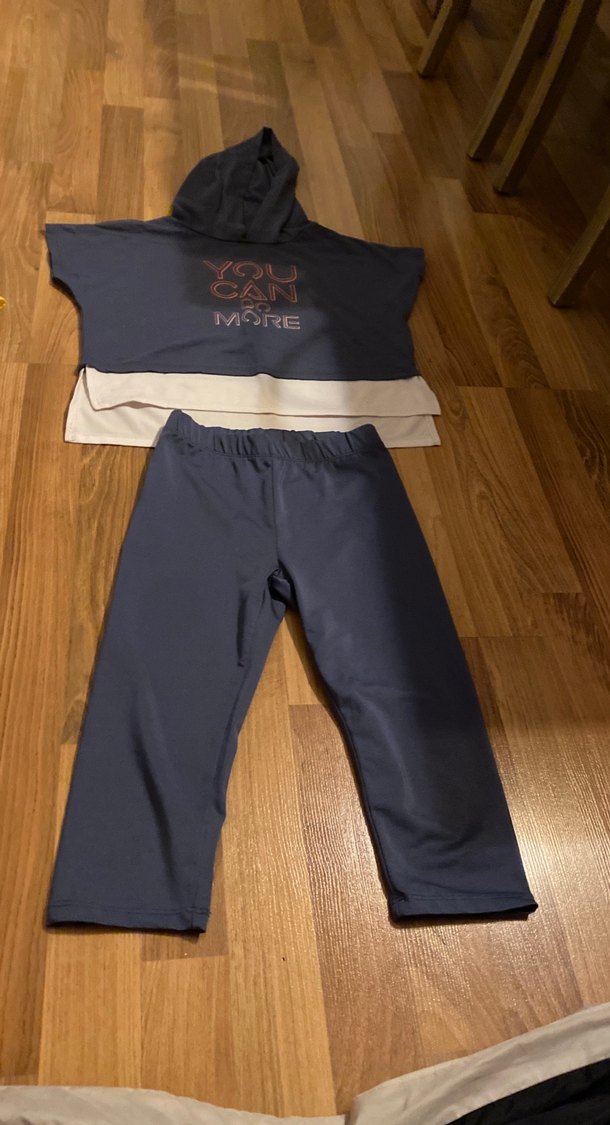 Kızlar için bol kesim, kapüşonlu kısa kollu tişört ve elastik bel eşofman altından oluşan gri takım. Önünde motivasyon mesajı baskılıdır. Tayt spor tayt kumaşıdır 7.8 yaş temiz ürün