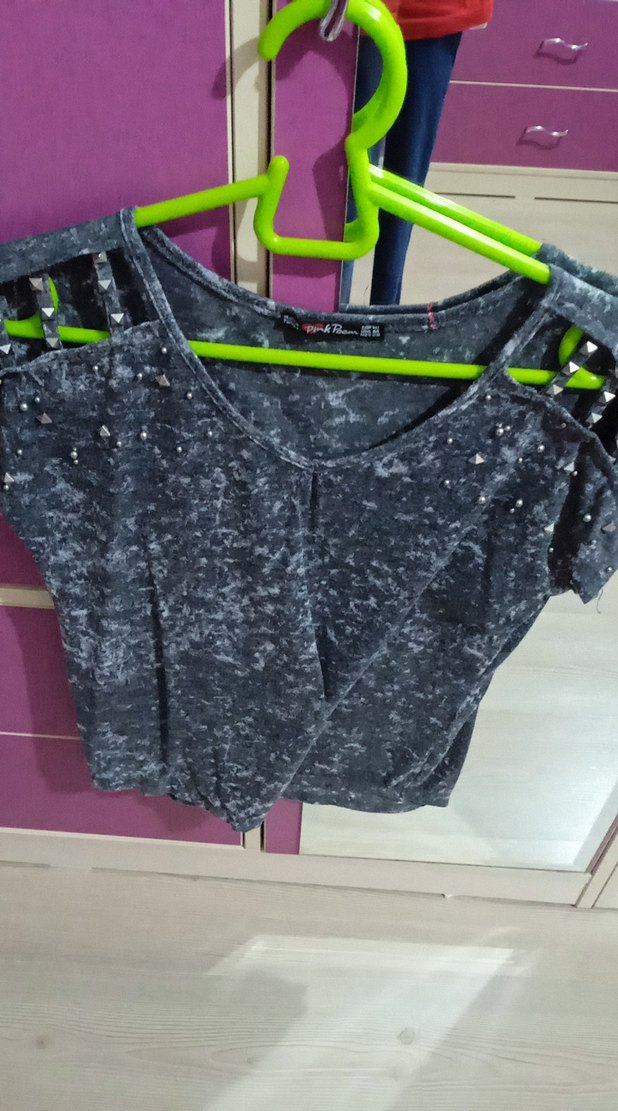 Gri tie-dye desenli, kemerli detaylı askılı, dar kesim denim kız gömleği. Bisiklet yaka ve sokak stili için uygun.