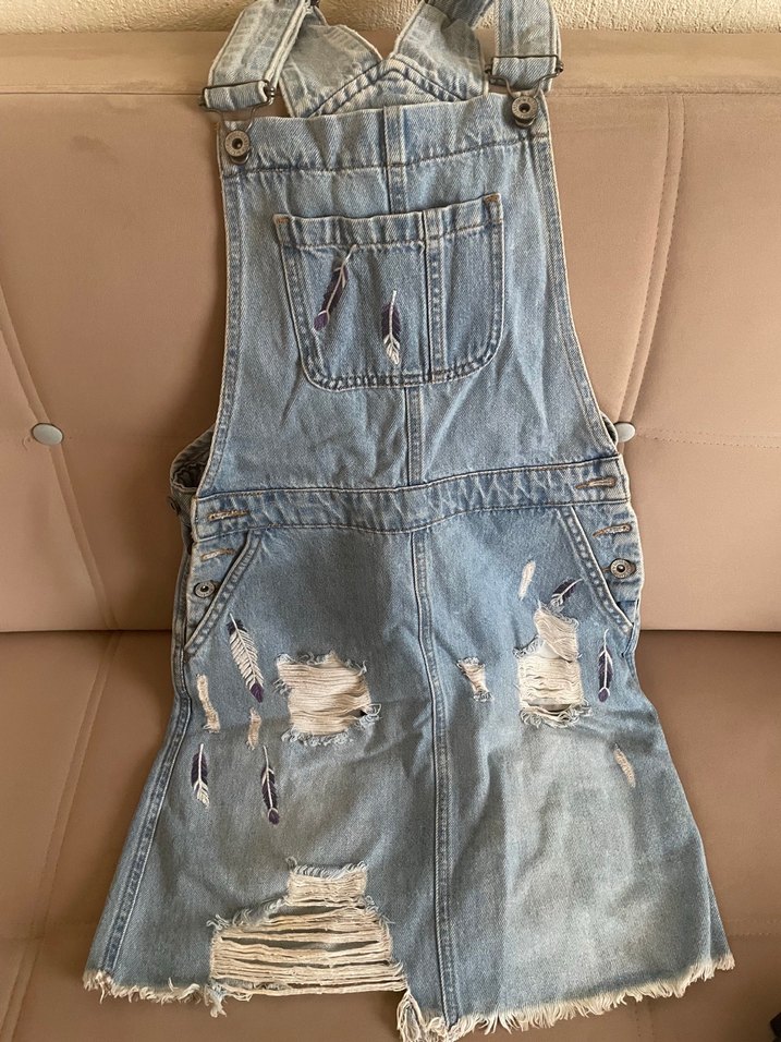 Gevşek kesim, askılı kot salopet, tokalı detaylar ve yırtık efektleriyle sokak modası tarzında. Ön cepli, gri-mavi renk tonlarında.