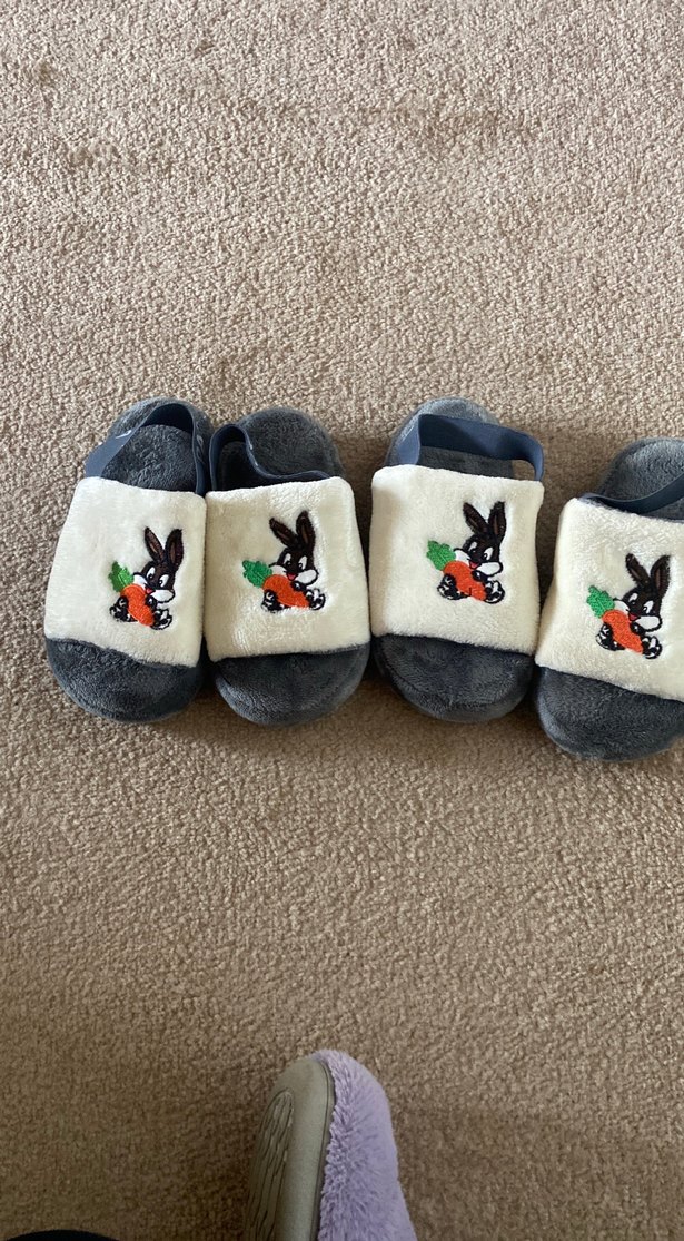 Kızlar için yumuşak, kürk hissi veren kumaştan, nakışlı tavşan ve havuç detaylı terlikler. Ayarlanabilir cırt cırtlı kayışlı, gri renkli sokak tarzı.