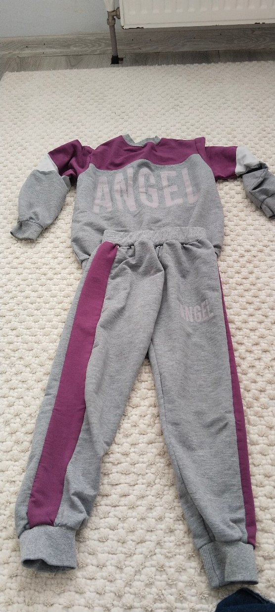 Kızlar için bol kesim, pamuklu ve örme dokulu gri eşofman takımı. Uzun kollu, bisiklet yaka üst ve yanları mor şeritli pantolon içerir. Rahat ve şık.