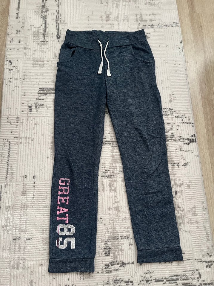 Kızlar için bol kesim gri denim eşofman altı, baskılı ve fermuarlı cepli. Bağcıklı bel ve rahat sokak stili sunar. GREATBS baskı detayı vardır.