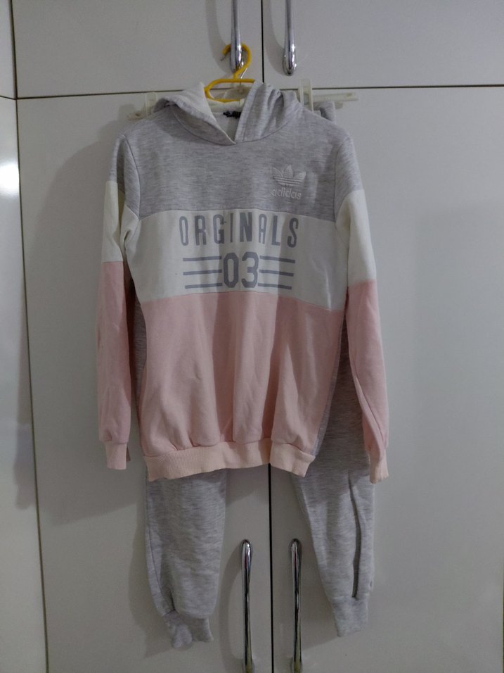 Kızlar için gri, beyaz ve pembe renk bloklu, rahat kesim eşofman takımı. Yumuşak sentetik kumaştan, bisiklet yaka ve uzun kollu, şık ve rahat bir görünüm sağlar. ♀️