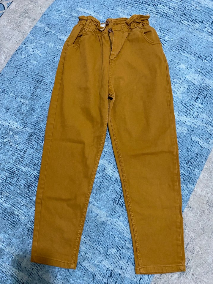 Kızlar için kahverengi bol kesim kot pantolon, kemerli bel detayıyla rahat ve renkli bir sokak stili sunar.