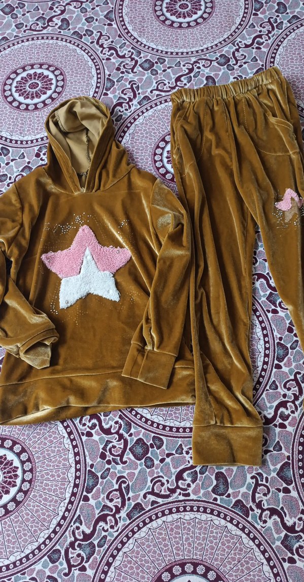Kahverengi, kapüşonlu ve loose fit olan bu kız eşofman takımı, nakışlı ve sequinsli yıldız detaylarıyla bohem ve retro tarzını yansıtıyor. ✨