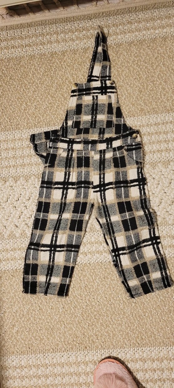 Yumuşak yün kumaştan yapılmış, gri kareli desene sahip, bol kesim kız tulumu. Askılı ve tokalı detaylarla sokak stiline uygun.