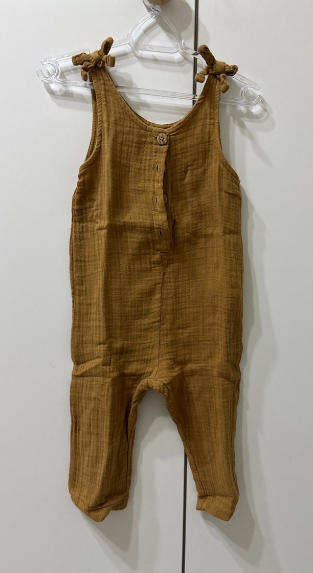 Kızlar için bol kesim, kolsuz kahverengi müslin tulum. Önde düğmeli ve bohem tarzda, yumuşak ve nefes alabilen kumaştan.