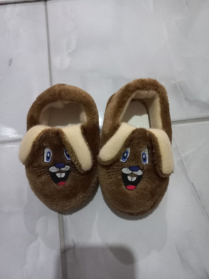 Kızlar için kahverengi nakışlı yüz detaylı, yumuşak kürklü sıcak ve rahat terlikler.