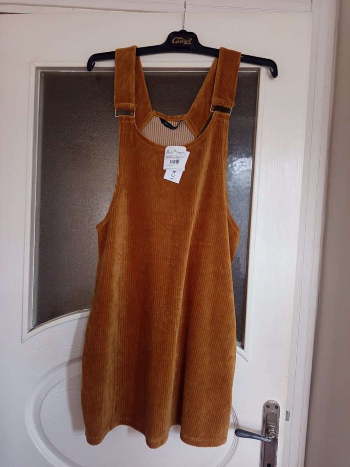 Kahverengi süet, askılı ve bol kesim overall elbise, parlak görünümlü ve tokalı detaylara sahip. Sokak tarzı için uygun.