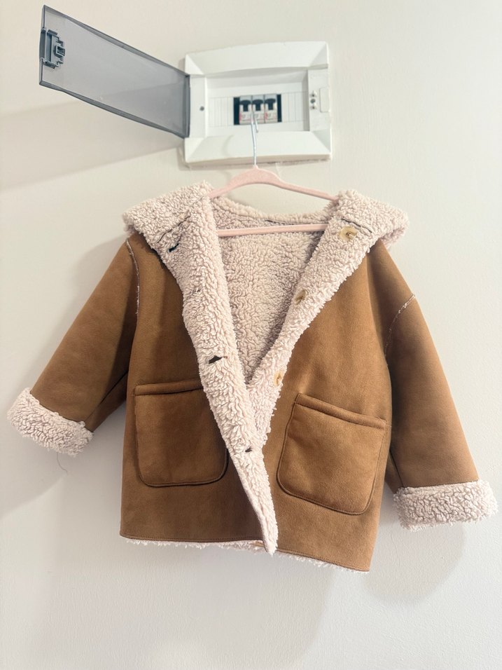 Kahverengi süet kumaştan, kürk detaylı, kesik yakalı, bol kesim kız çocuk ceket, trend sokak stili için uygundur.