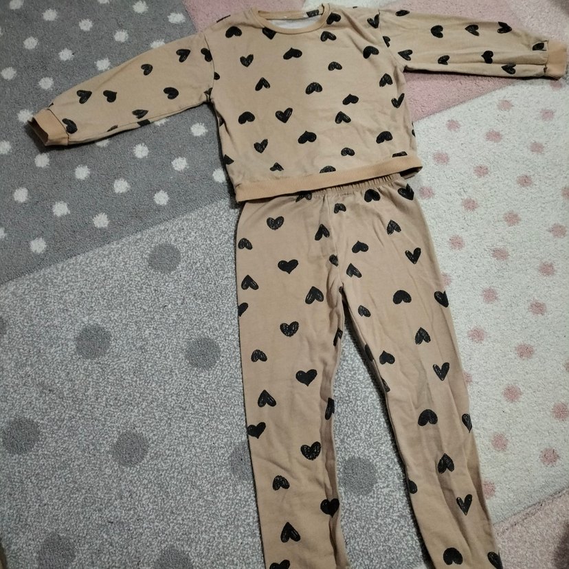 Kızlar için bol kesim, uzun kollu, pek kalp desenli eşofman takımı. Siyah kalp desenleri ve trend sokak stili için uygun.
