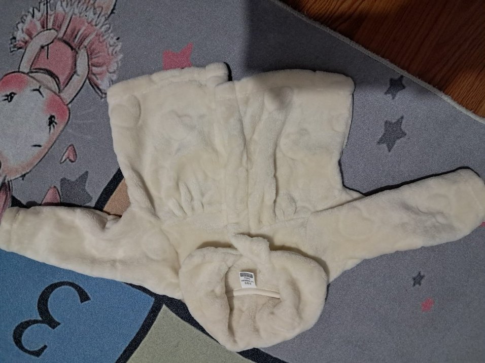 Kızlar için kapüşonlu, yumuşak kürk detaylı, beyaz renkli, dar kesim peluş ceket.