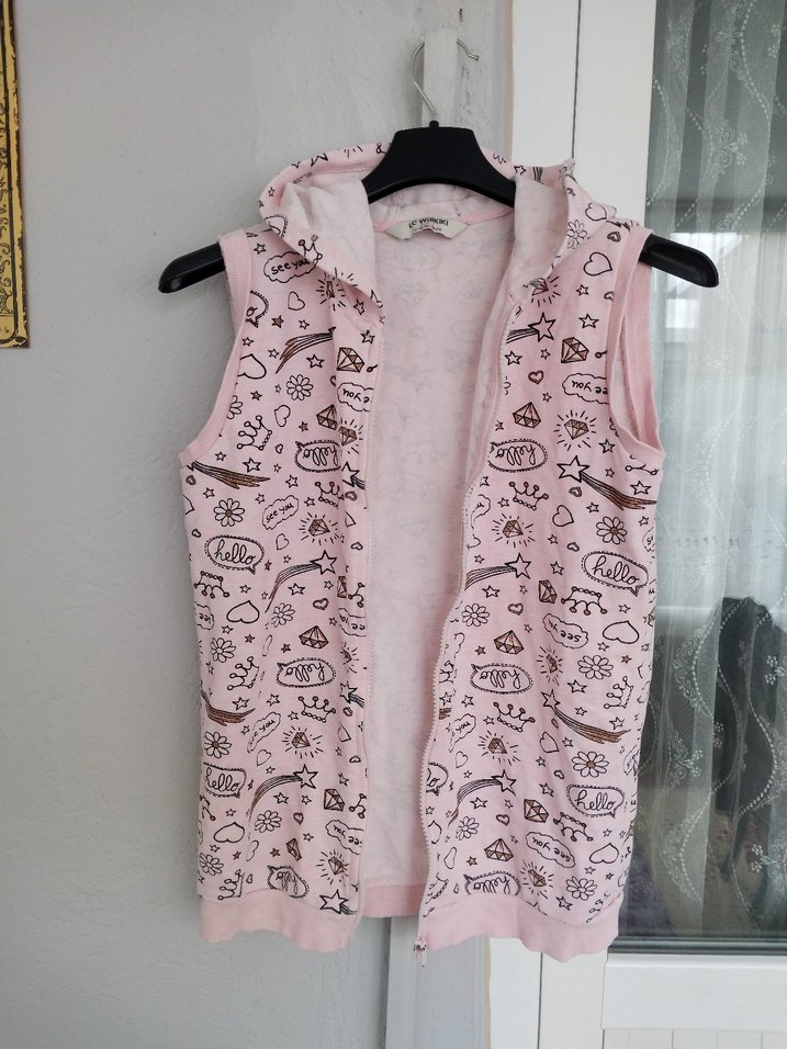 Kızlar için kapüşonlu, fermuarlı ve baskılı desenli pembe yelek. Yumuşak ve sıcak kumaştan, salaş kesimle tasarlanmıştır.