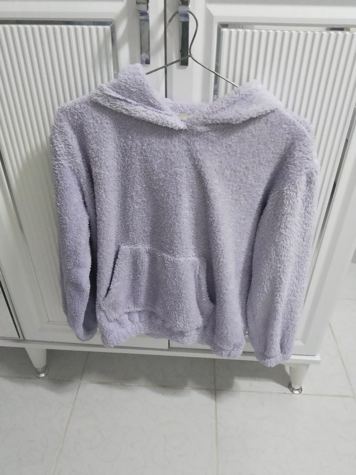 Kızlar için kapüşonlu, uzun kollu, bol kesim mor peluş kumaştan yapılmış, kürk detaylı sade kazak. Önde cep bulunur.