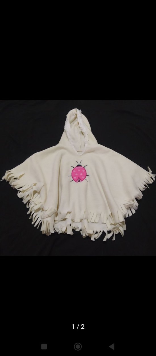Beyaz fleece kız pelerini, kapüşonlu ve nakışlı renkli uğur böceği deseniyle. Uzun kollu, püsküllü ve bol kesim, bohem ve retro tarzını yansıtıyor. marka temsilidir