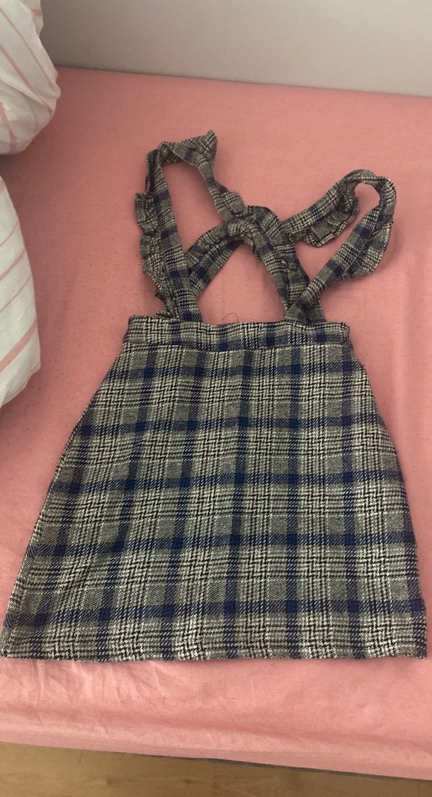 Mavi Gri kareli kumaştan, askılı elbise az kullanıldı çok iyi durumda
