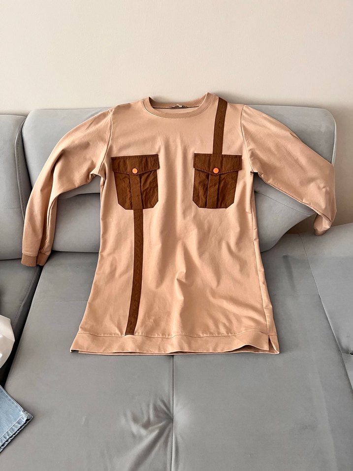 Kızlar için bej renkte, uzun kollu, deri kumaştan kemerli ve cep detaylı bol kesim sweatshirt. Sokak tarzı için uygundur.