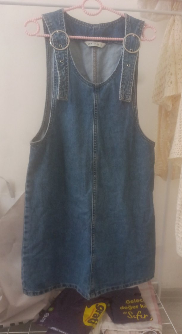 Kızlar için kemerli askılı, bol kesim ve mavi renkte sade denim elbise.