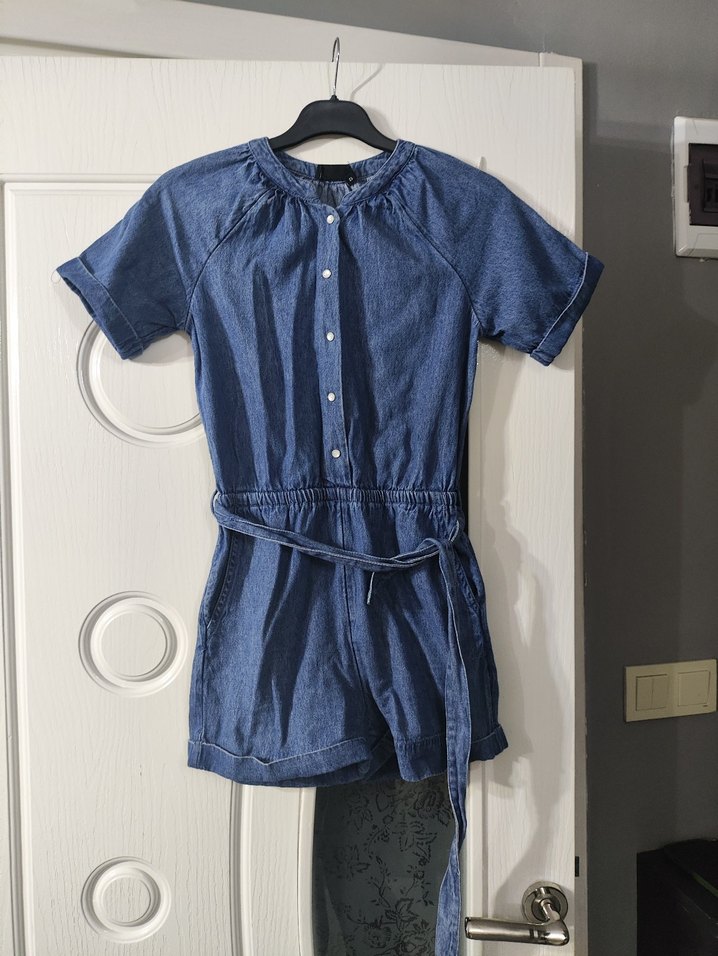 Kızlar için Kemerli Kısa Kollu Denim Tulum