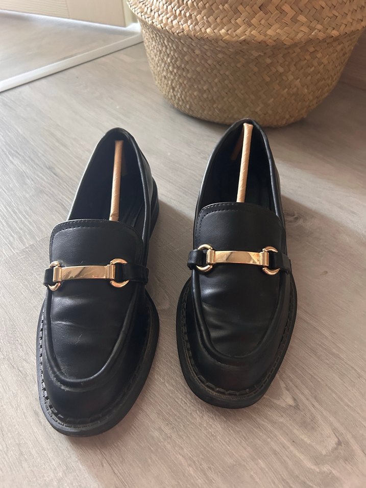 Kızlar için siyah deri loafer, parlak altın renkli tokalı ve sokak giyimi tarzında. Yalnızca 3 kere giydim. Tarzıma uygun olmadığı için satıyorum.