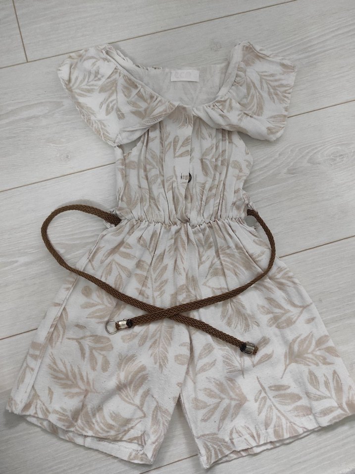 Keten kumaştan, yaprak desenli, kemerli ve askılı kız tulumu. Rahat kesimli ve bej-gri tonlarında. 3 yastan itibaren 4 e kadar olacak büyükluktedır, temızdır