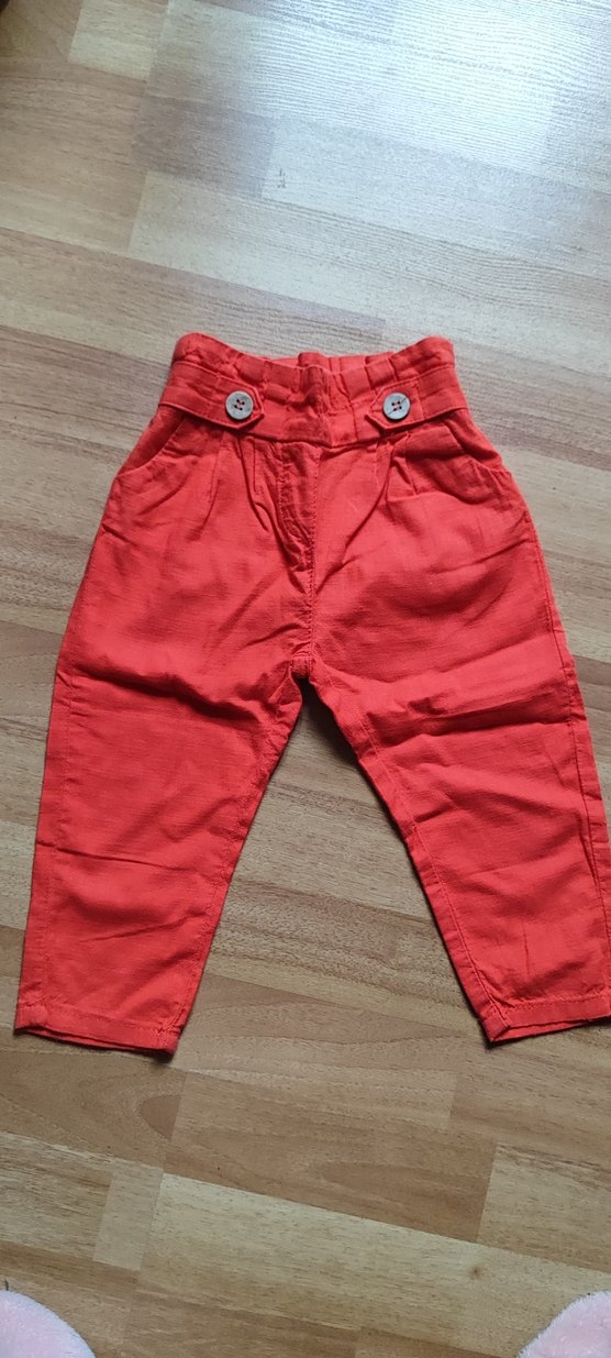 Rahat kesim, kırmızı renkli keten kumaştan, düğmeli bel detaylı kız çocuk pantolonu, sokak stili için uygun.
