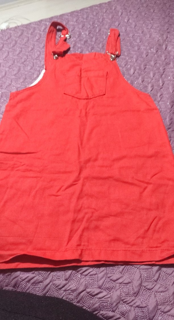 Yumuşak sentetik kumaştan üretilmiş, askılı ve fırfırlı detayları olan kırmızı renkli, bol kesim kız tulumu.