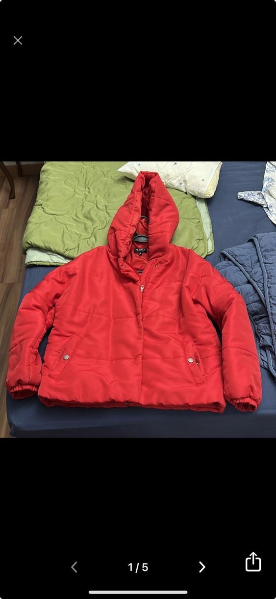 Kırmızı kapüşonlu, fermuarlı, yumuşak ve sıcak polar kumaştan yapılmış, uzun kollu, normal midi boyda, dış mekan için uygun dar kesim mont.