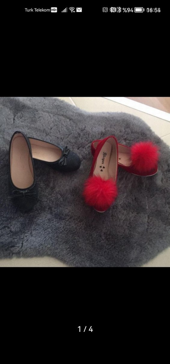 Kızlar için kırmızı, kürklü ponpon detaylı babetler. Rahat kauçuk taban ve şık leopar desenli tasarıma sahiptir.