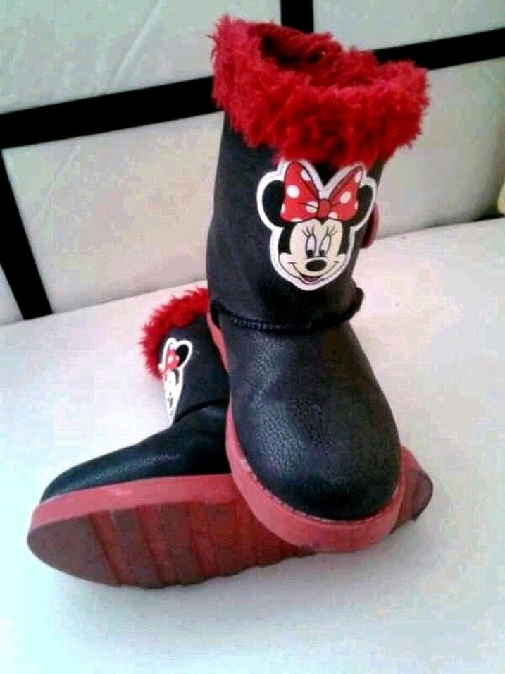 Kırmızı kürklü detaylara ve Minnie baskısına sahip renkli kız botları, rahat ve şık bir görünüm sunar.