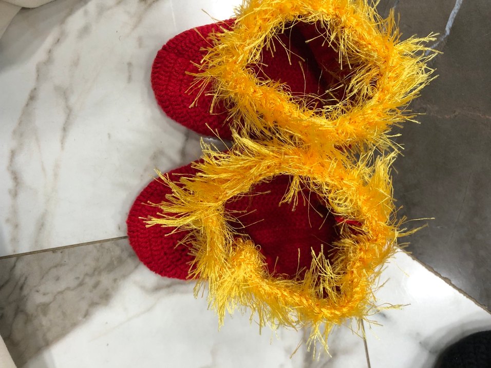 Kızlar için kırmızı örgü ev terliği, renkli nakışlı desenler ve parlak sarı tüylü detaylarla bohem ve retro tarzını yansıtıyor.
