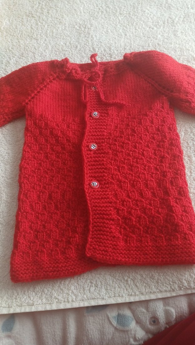 Parlak kırmızı renkli, uzun kollu, bohem tarzda, örgü dokulu kız çocuk hırkası. Düğmeli ve vücuda oturan kesime sahip. fiyat 400