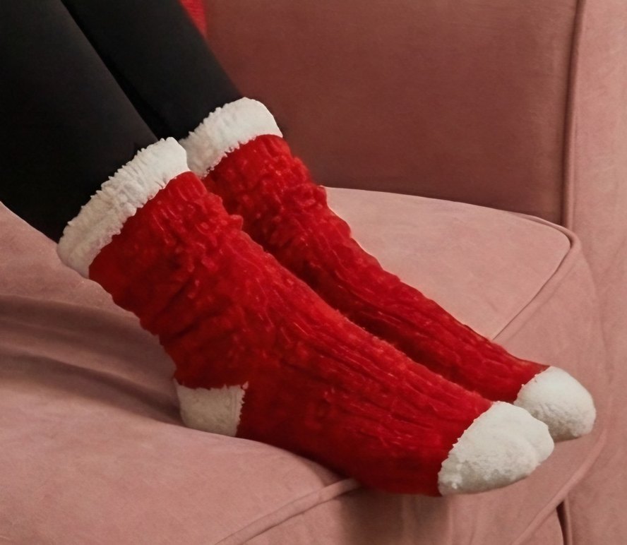 Yumuşak fleece malzemeden yapılmış, beyaz detaylı kırmızı örgü kızlar için sıcak çoraplar. Rahat ve renkli.