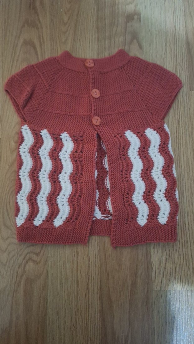 Kızlar için kolsuz, kırmızı örme hırka. Ön kısmında beyaz dalga desenleri ve düğmeler bulunur. Bohem tarzda, vücuda oturan model.