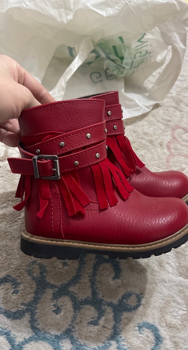 Kızlar için kırmızı deri botlar, tokalı kayışlar ve püskül detaylarıyla bohem ve punk rock tarzını birleştirir. Rahat taban ve renkli işlemeler içerir.