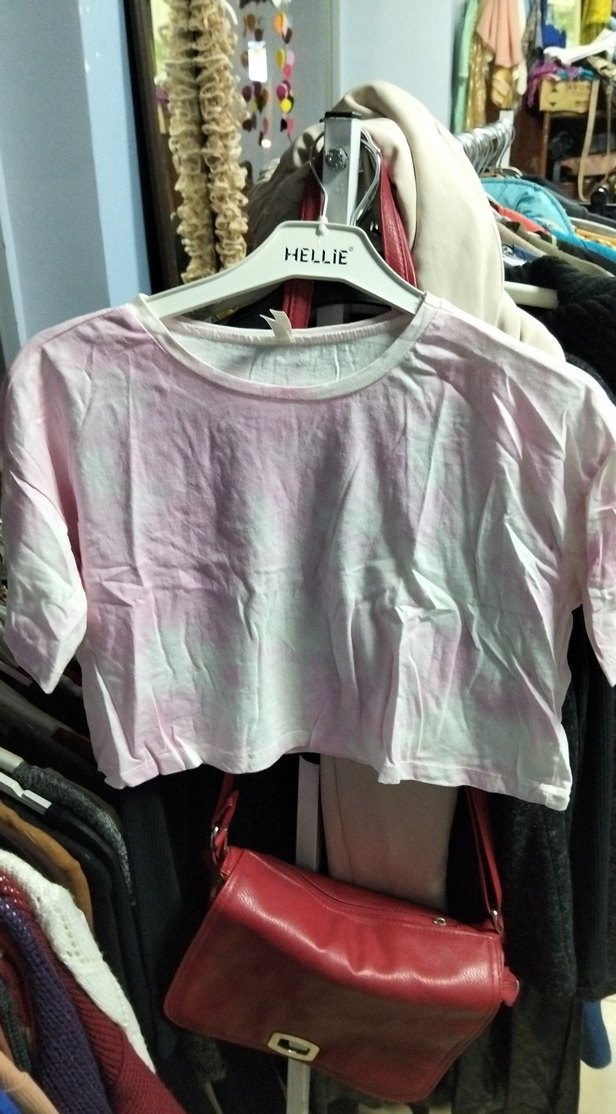 Kızlar için pamuklu, bol kesim pembe batik desenli tişört. Kısa kollu, yuvarlak yaka ve fırfır detaylıdır.