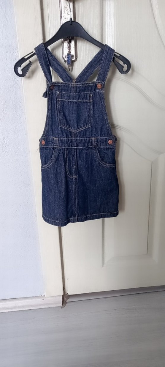 Koyu lacivert denim kumaştan yapılmış, askılı ve tokalı, kızlar için dar kesim bir elbisedir. Sokak tarzına uygun, desensiz tasarıma sahiptir.