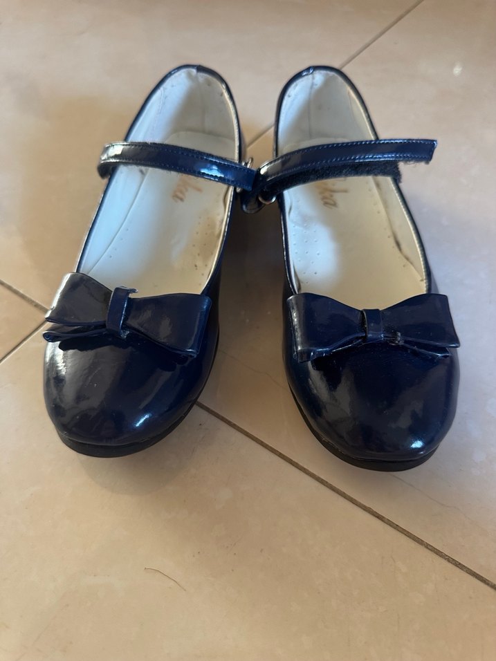 Koyu mavi renkte, tokalı bantlı ve önünde fiyonk detaylı kızlar için kauçuk babet ayakkabı. Sade ve şık tasarım.