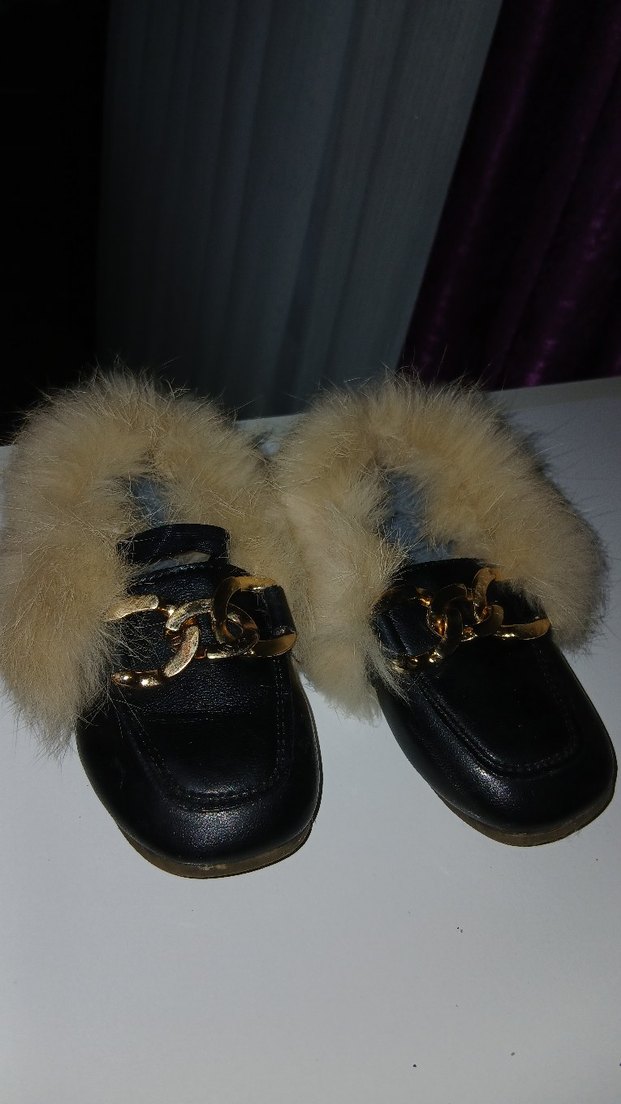 Kızlar çocuk için koyu kahverengi deri terlik, kürk detaylı ve gotik tarzda, ayakları sıcak tutar. 25 no dior ama kalıbı bıraz ufak