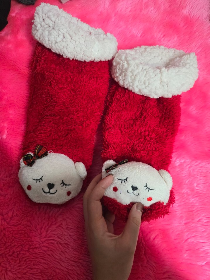Kızlar için kırmızı, yumuşak ve sıcak ev terlikleri, kürklü manşet ve nakışlı ayıcık detaylarıyla rahat kullanıma uygundur.