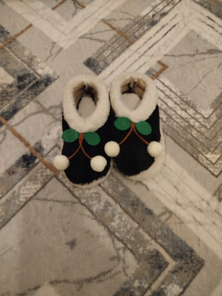 Kızlar için yumuşak, sıcak kumaş ve bilekte kürk detaylı terlikler. Koyu tabanda yeşil yaprak ve beyaz ponponlu nakışlı desen bulunur. Rahat ve konforlu.