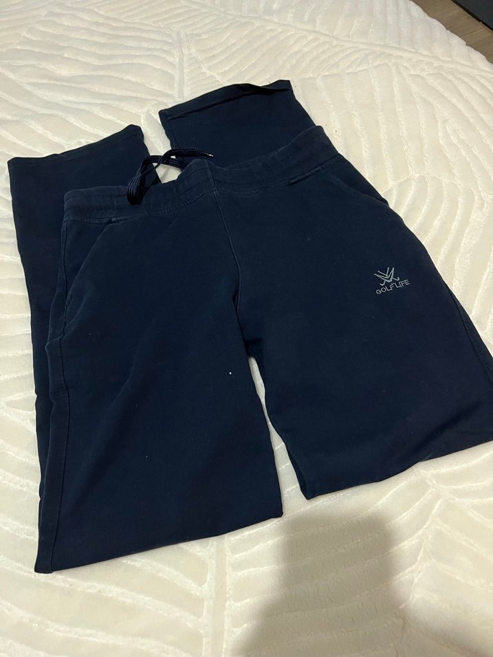 Lacivert renkli, fermuarlı cepleri olan, kızlar için dar kesim eşofman altı. Yumuşak ve sıcak kumaştan, sade ve temel sokak stili.