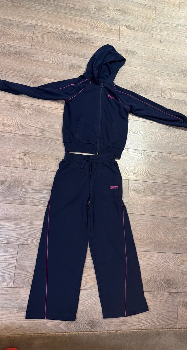 Lacivert renkli, fermuarlı kapüşonlu ve uzun kollu kız eşofman takımı, yumuşak ve rahat kumaştan yapılmıştır. İnce pembe çizgilerle sade ve şık bir görünüm sunar.
