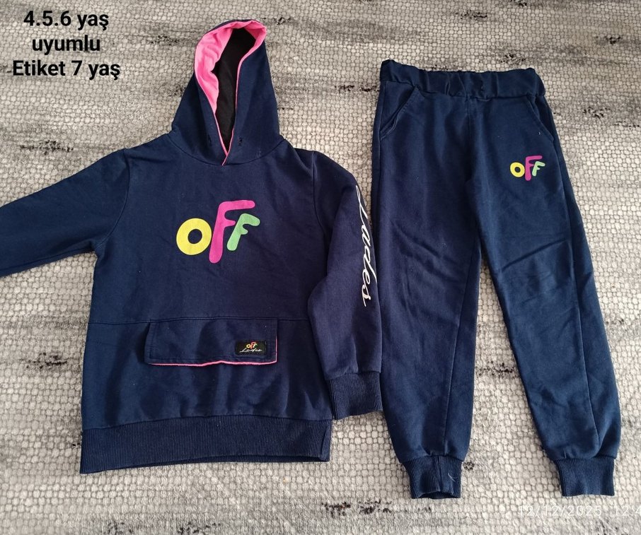 çok güzel kaliteli bir takım 7 yaş yazıyor ama 3 4 5 uyumlu ☘️Lacivert renkli, yumuşak dokulu kız eşofman takımı; kapüşonlu, uzun kollu, fermuarlı ve bol kesimdir. Üstte renkli 'oF' baskı ve kontrast kapüşon astarı bulunur. ️