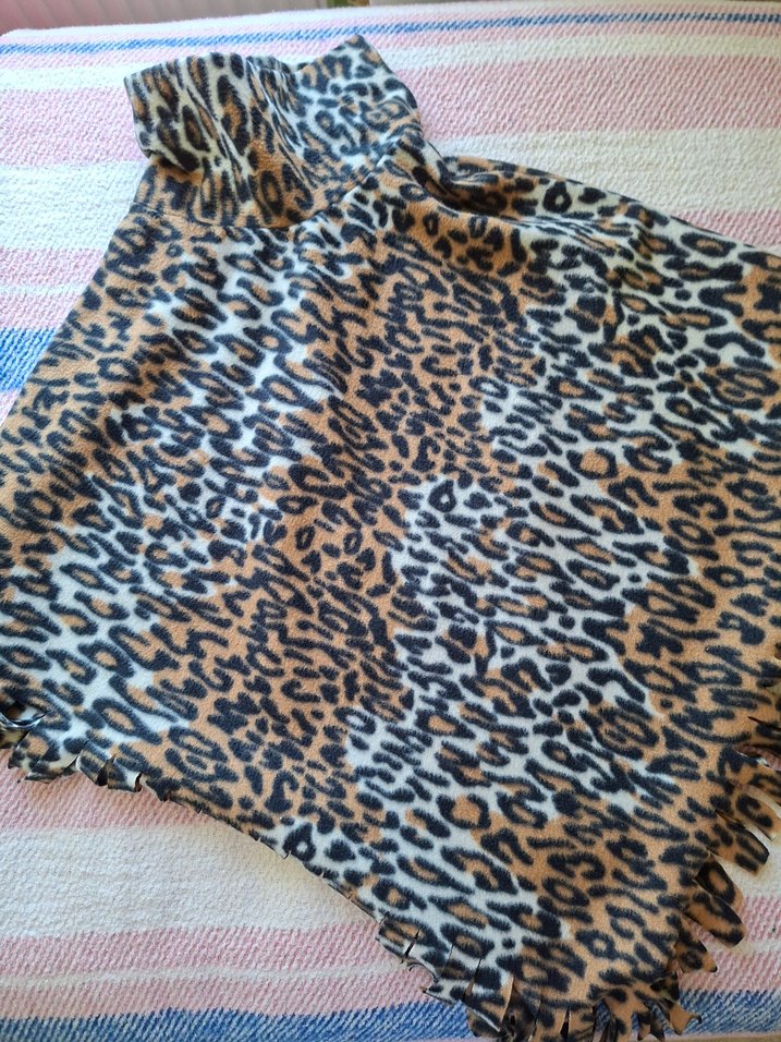 Kızlar için leopar desenli, bol kesim panço. Kürk detaylı, bohem ve retro tarzda, boğazlı ve uzun kolludur. Koyu kahverengi renktedir.
