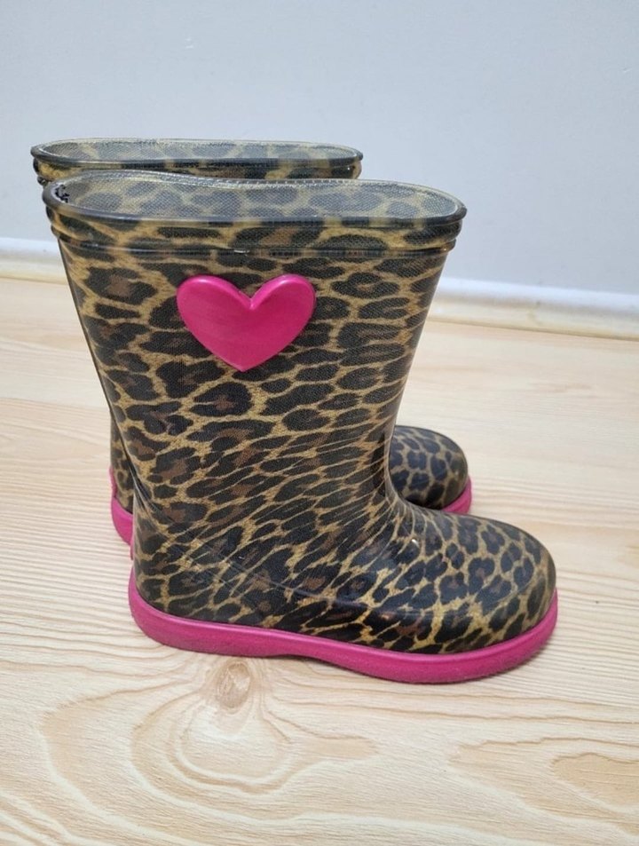 Kızlar için leopar desenli kauçuk botlar, renkli pembe kalp detayı ve tokalı tasarıma sahiptir. Bohem ve retro tarzındadır.
