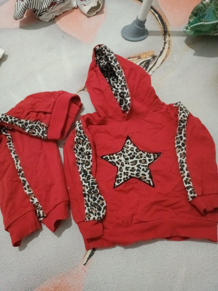 Kızlar için leopar desenli, kapüşonlu ve uzun kollu kırmızı sweatshirt. takım konuma bağlı kolunda çok minik bir leke var çıkar mı çıkmaz bunların hiç uğraşmadım fiyatı ona göre koydum alana hayırlı olsun