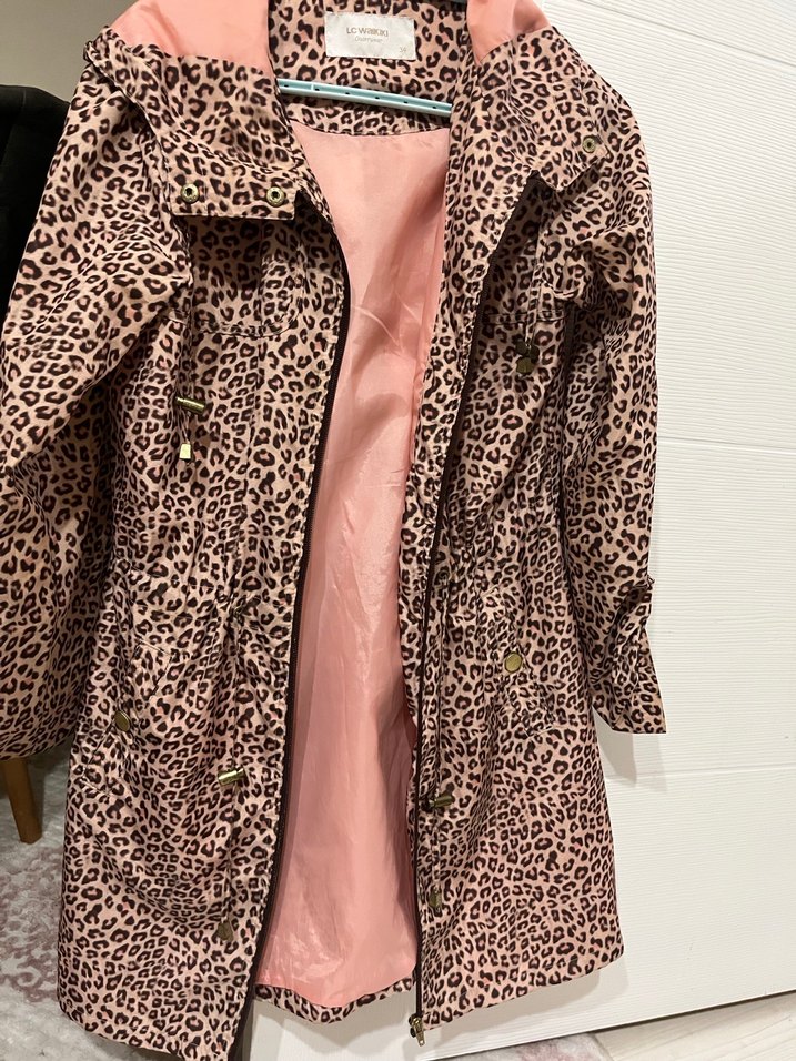 Leopar desenli, kürk detaylı, pembe pastel renkli kız yağmurluğu. Sentetik kumaştan, kesimi dar ve yakası kesik yakalıdır.