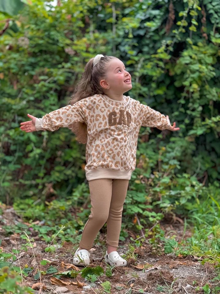 Leopar desenli kız çocuk takımı Yumuşak ve rahat kumaş ✨ Üst sweatshirt + alt tayt kombin Günlük kullanım için ideal Şık, modern ve tatlı bir duruş Rahat kalıp – çocukların hareket özgürlüğünü kısıtlamaz 2-3 yaş tam kalıp